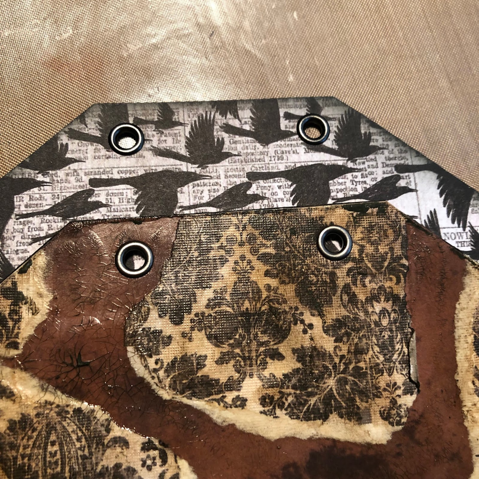 Once all of the pages have been covered and the front and back cover finishes are dry, I determine the best location for my binding holes.The first step is to determine the onset of the interior pages, be sure that wherever you decide to place your binding will incorporate the pages. I decide to use 3/16" eyelets to accommodate the binding rings. The holes are set an appropriate distance in to allow for a border around the eyelet. Using a crop-a-dial I punch my holes and set the eyelets. The next page is aligned, and the hole locations are marked then punched and eyelets set.